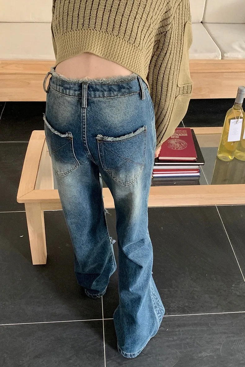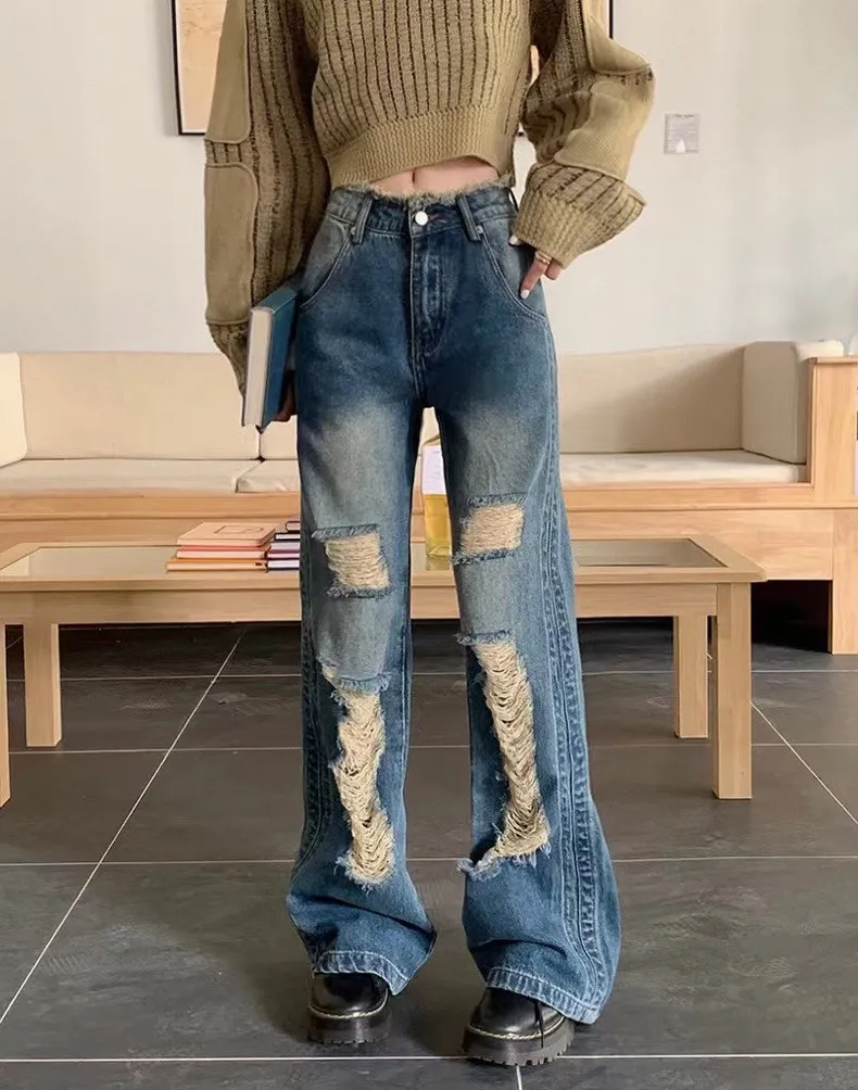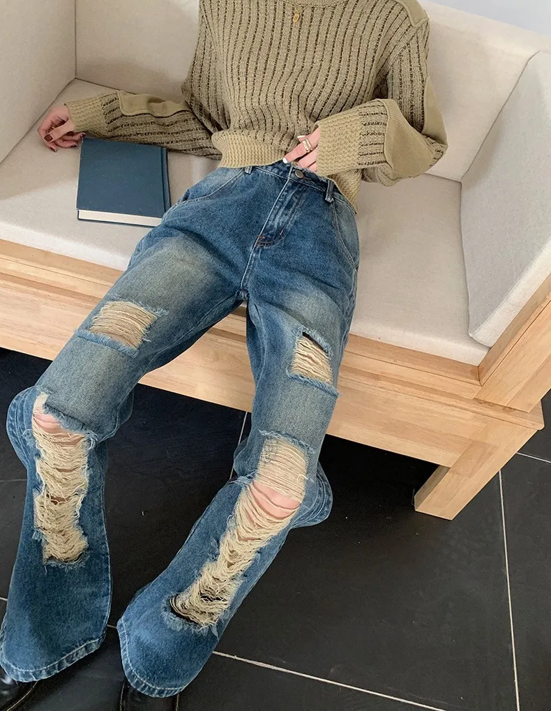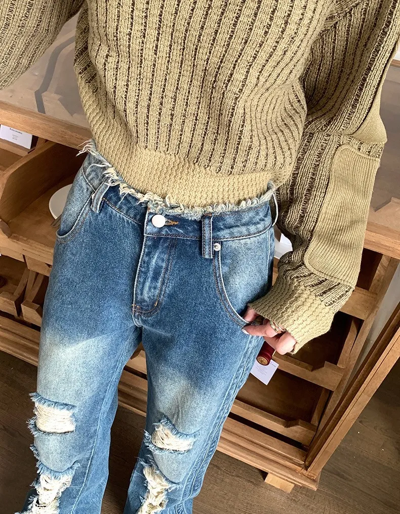 高腰牛仔毛邊刷破褲